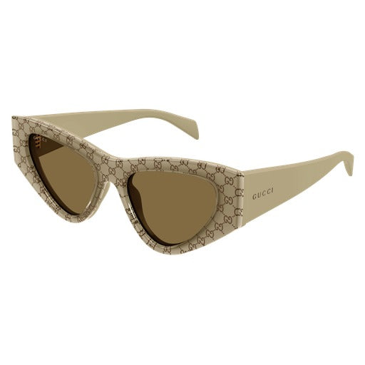 Modello ispirato alla sfilata di Sabato de Sarno, declinato in una splendida palette cromatica. Forma cat-eye in acetato con pattern G Monogram e una speciale applicazione in tela su tutta la montatura in una SKU. Logo istituzionale Gucci sulle aste.