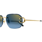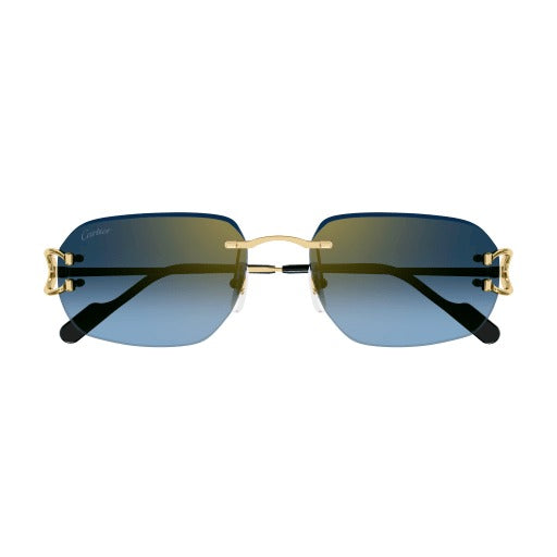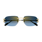 Montatura da sole a giorno impreziosita dall’iconico dettaglio C de Cartier, elemento funzionale ed estetico della cerniera in metallo. Nuova montatura facile da indossare dalla morbida forma rettangolare con lenti colorate, impreziosita da un sofisticato effetto smussato per un look unisex e moderno. Terminali in acetato impreziositi dalla targhetta con logo Cartier per un comfort ottimale. Preziose finiture in oro.
